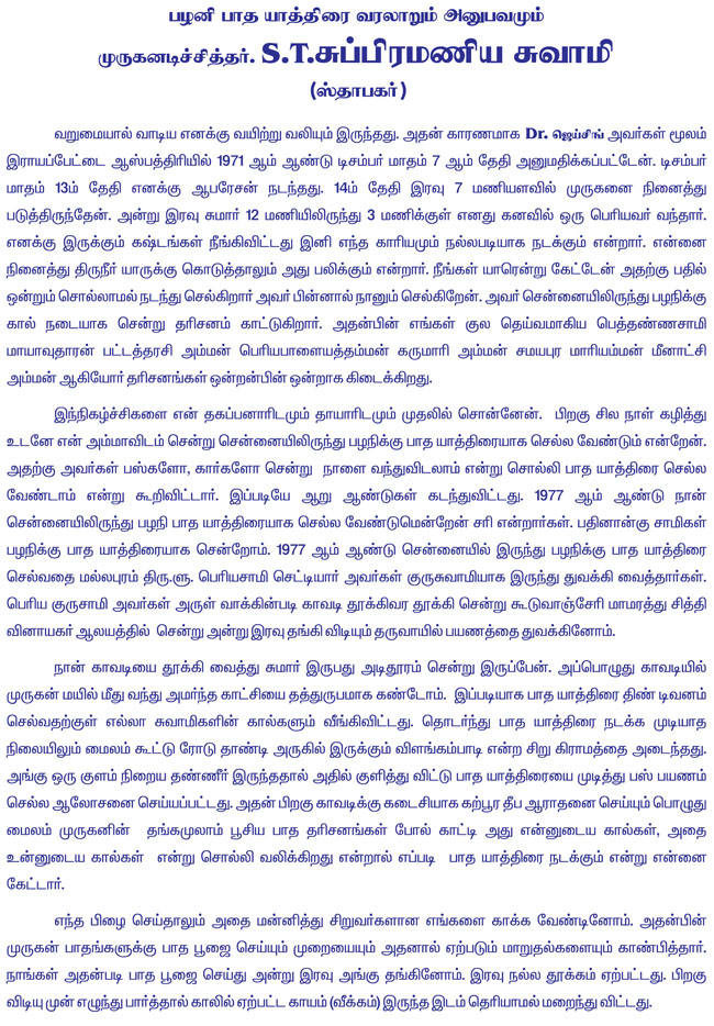 On returning home from the hospital I first told the entire experience & happenings to my father & mother. And After some days I told my mother that I am going to take a Pilgrimage from Chennai to Palani by walk but my parents refused to send me & i instead they advised me to take bus or car to Palani. In 1977, I once Again told my parents that I want to take a pilgrimage as I desired from Chennai to palani by walk & they accepted. Along with fourteen swamy’s I took my Palani pilgrimage, the first year voyage was Flagshiped by Mamallapuram Sriperiasamy chettiar & he was om chief swamy. As per the blessings of our chief swamy we took kavadi & that night of the first days journey we stayed in Guduvanchery mamarathu vinayagar temple. When I took twenty steps with the kavadi we were able to see the real image of Murugan sitting on the peacock. So like this our voyage continued till Tindivanam & the mean time we reached Tindivanam, foot of all Swamy’s who came along with me were swollen. So slowly we reached Mylam coot road & we took bath in a small pool in the Vilakkampadi Village & then we decided to stop om pilgrimage by walk & planned to continue by bus, so as a last pooja we showed karpuram to the kavadi at that movement lord Murugan showed us the Glittering beautiful Golden foot of his intimated to me that the foot with which we are doing the pilgrimage belongs to him & so he told me that there is no point in discontinuing the pilgrimage. So then we realize our mistake & we prayed to him to forgive us for our silly thoughts. Then he showed us his foot pooja to be performed while on the moves & its effects. Then on the same day night, we slept well. In the morning when we got up & saw on legs were perfectly alright.