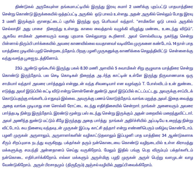 We Started om journey at 8.30 in the morning of our 23rd year of Palani pilgrimage,we were walking along a thick forest, at that time a nude man came from the forest, seeing him one of our swamy T.Bose took his towel and tied it around the man’s waist. We had nothing to offer him expect money. We gave him some money but he refused to take it & told that we can buy what he wanted with this money. & he walked few steps and disappeared. Then too our surprise we were able to see the towel lying on the floor which we gave it to him. By seeing this all of us were stunned in silence. At that moment we were able to see lord Murugan gave us a darshan as a ordinary man. By Murugan blessings our Palani pilgrimage is continuing for the past 34 years. We are able to give free meals to the people living on the way to the pilgrimage by the offerings given by the devotees.
